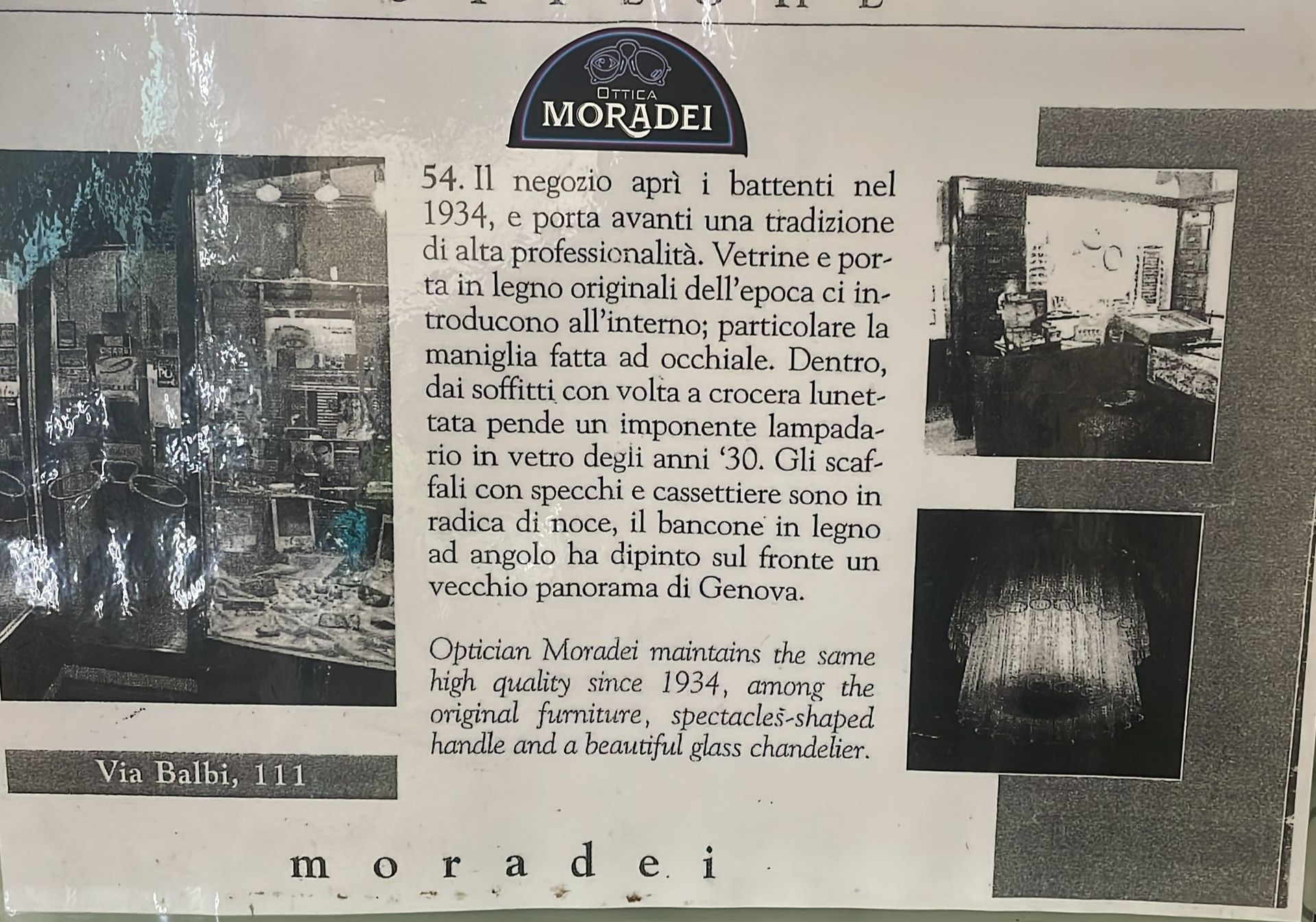 Ottica Moradei, fondata nel 1934, è un punto di riferimento storico nel cuore di Genova. Da oltre 90 anni, il negozio ha mantenuto una tradizione di eccellenza nel settore ottico, offrendo una vasta gamma di occhiali da vista e da sole, sia di marchi internazionali sia artigianali.
